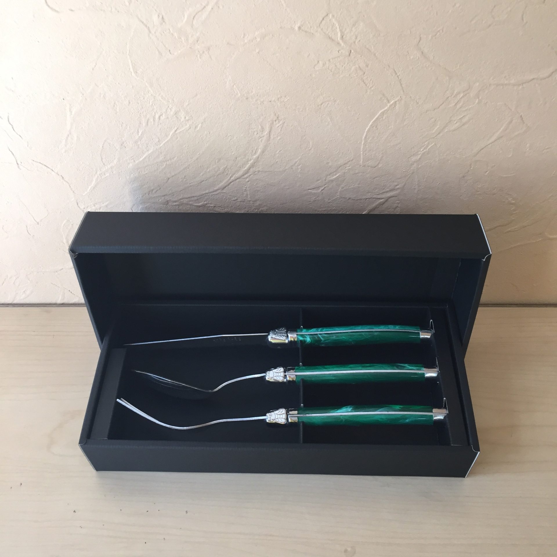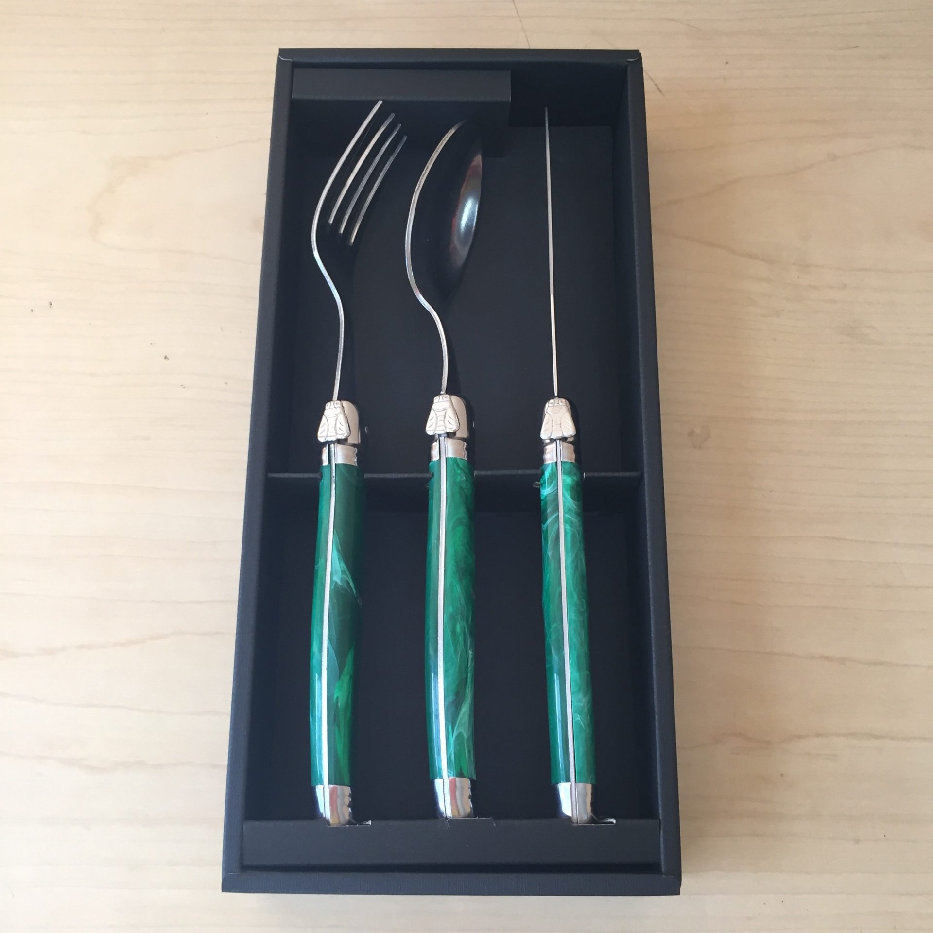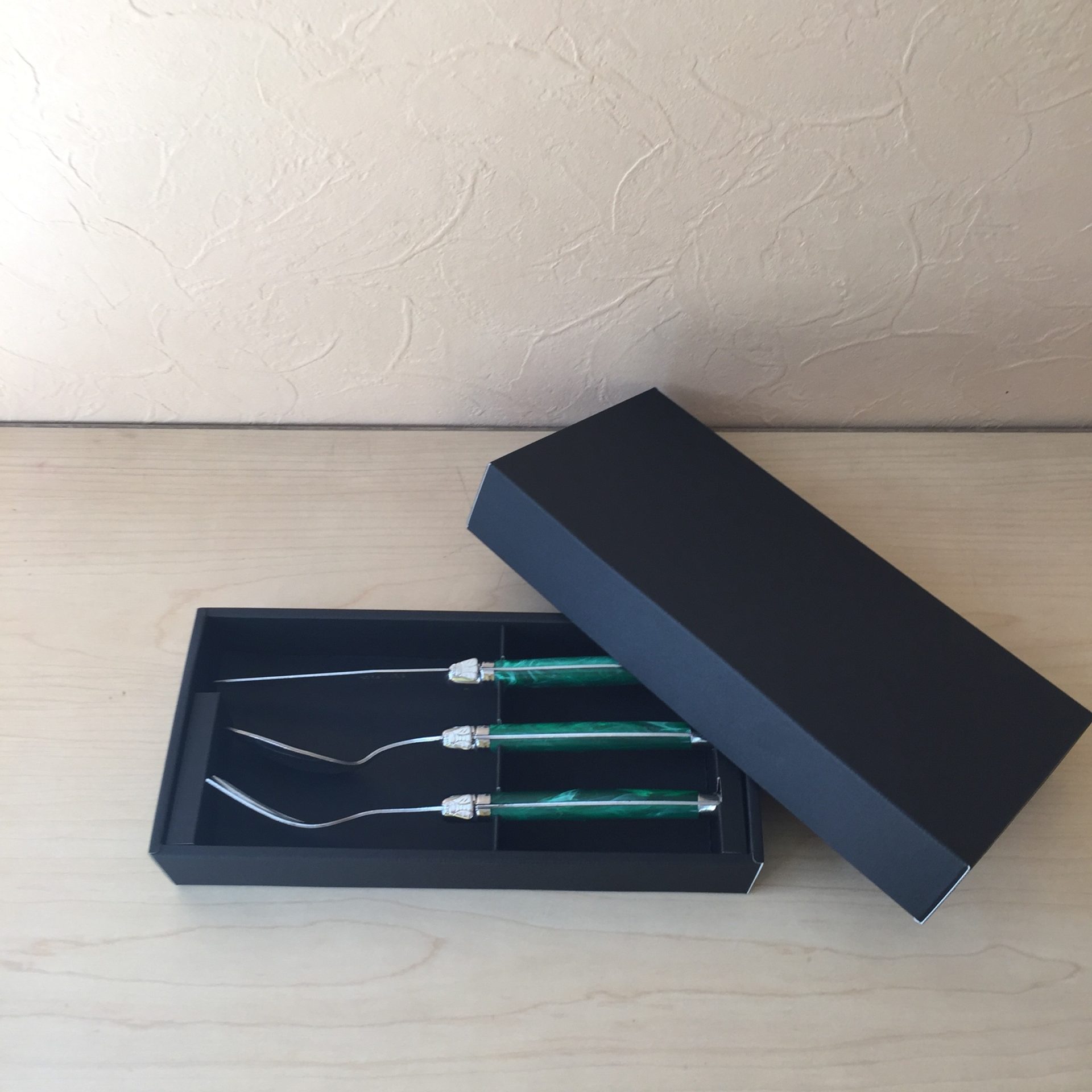 フォーク、スプーン、ナイフの3点セットを入れたカトラリーボックス
